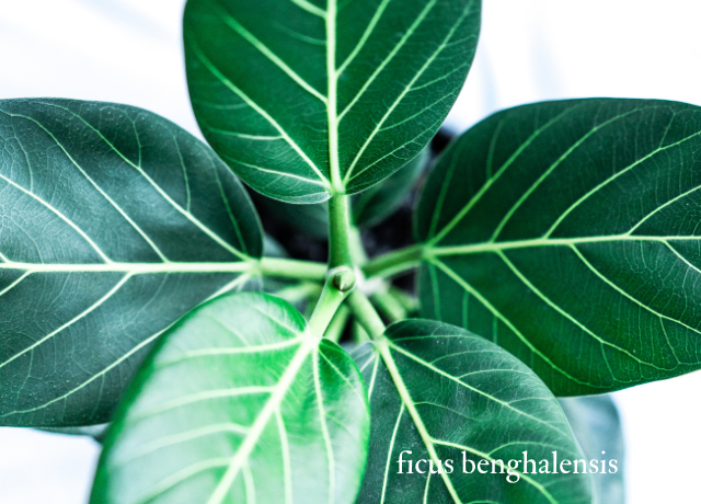 現地では「望みを叶える木」として認知されており、インドの国樹として神聖視されています。自然界では30m以上にもなる高木で、気根を地面に伸ばして大きく成長し、寺院の近くにも植えられるほど生命力と文化的な重要性を持つ植物です。ゴムの木の仲間で剪定をすると傷口からシュウ酸カルシウムという樹液を出し、肌の弱い方などはかぶれてしまいます。